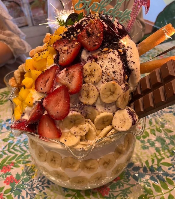 人間の頭よりも大きく、その中にはアイスクリーム、チョコレート、大福、シリアル、バナナが詰め込まれていた